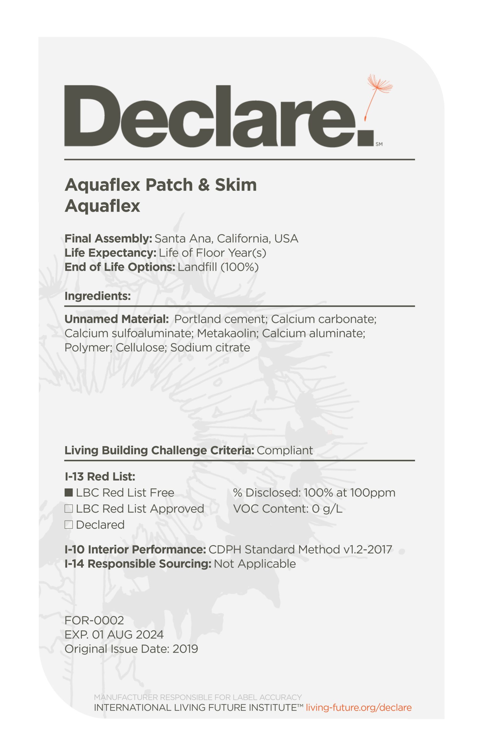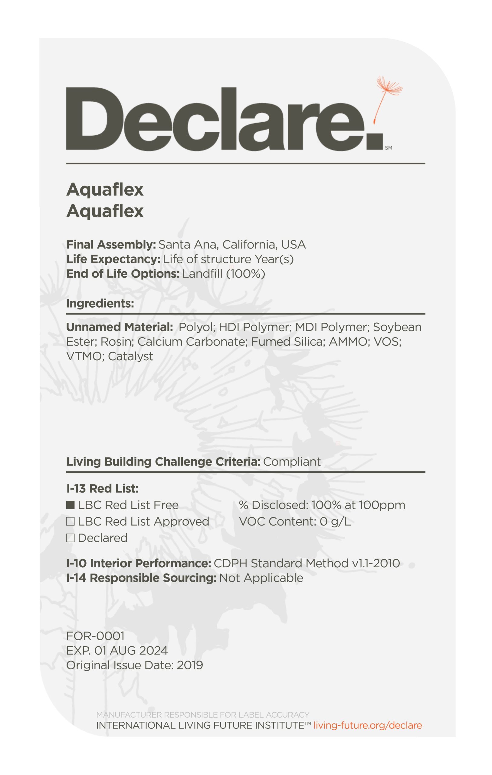 Aquaflex is designated a “Super Low-Emitter” by SCAQMD standards having a “0” VOC content, meeting SCAQMD rule 1168 and CHPS section 1350. |